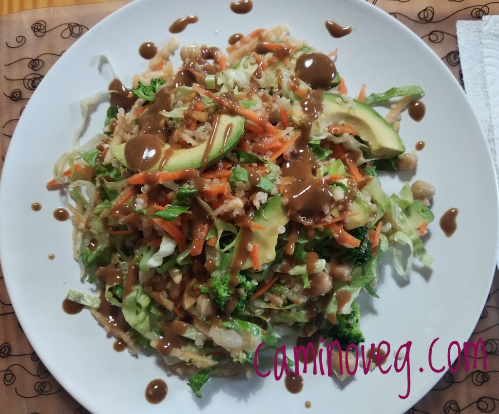 Preparamos el aliño en un bol pequeño: una cucharadita de mostaza, una cucharadita de shoyu, una cucharadita de sirope de ágave y un chorrito de aceite de oliva. Removemos con una cuchara para ligar todos los ingredientes. Probamos y ajustamos de aceite o cualquier otro ingrediente. Se trata de hacerla a nuestro gusto.