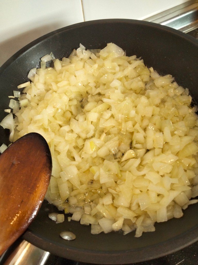 En una sartén o cazuela sofreímos la cebolla y el ajo con una pizca de sal, hasta que esté tierna.