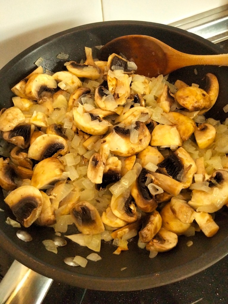 Añadimos los champiñones cortados en láminas y seguimos cocinando unos minutos.