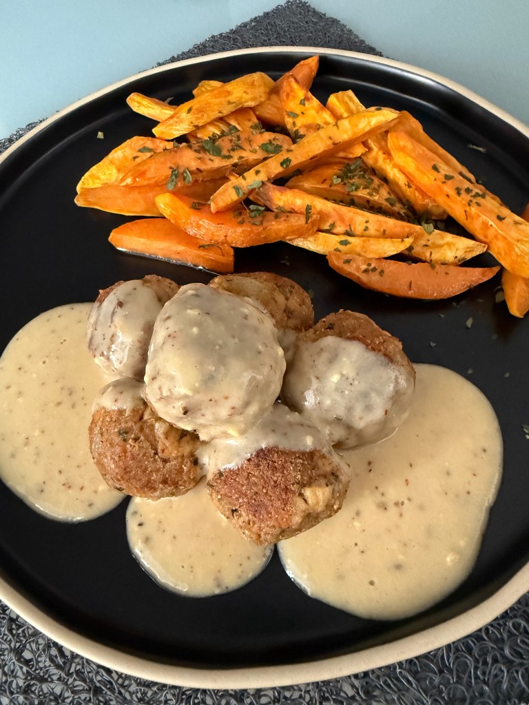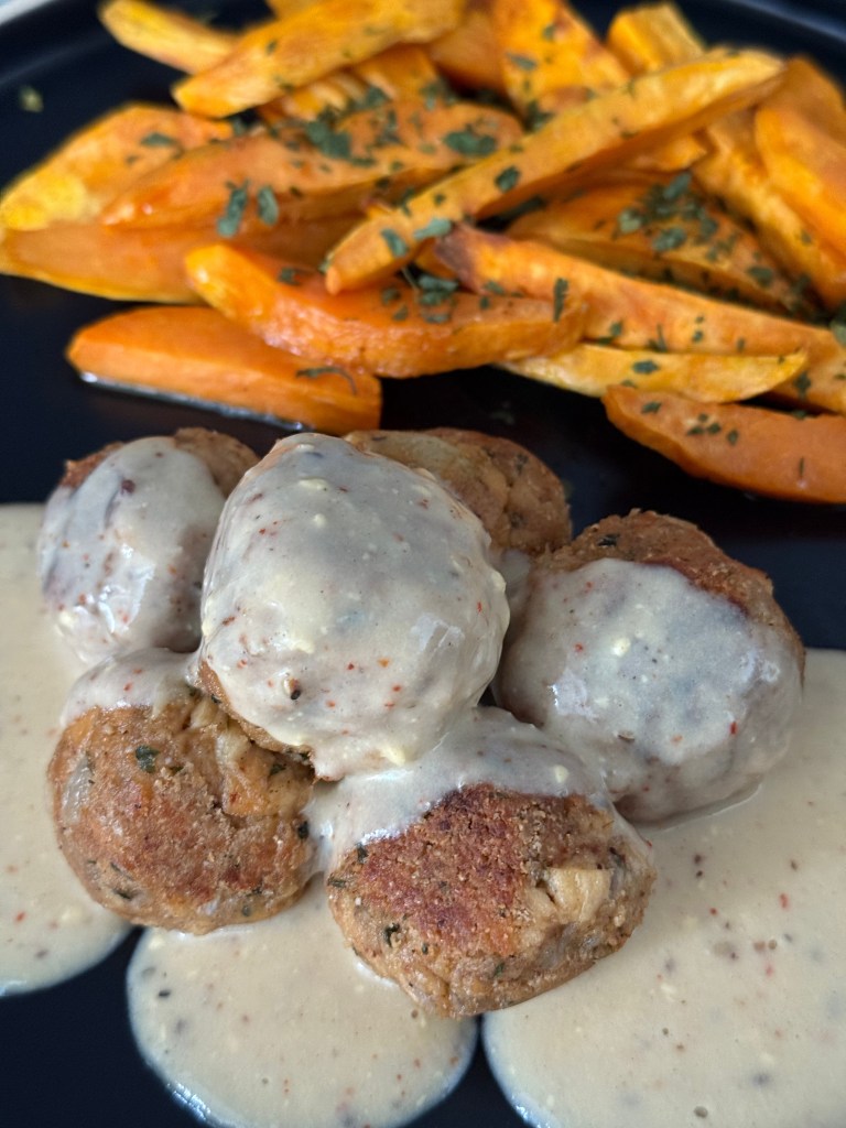 La soja texturizada es un derivado de la soja que ya podemos encontrar en supermercados. Es una fuente de proteínas estupenda y, aunque reconozco que la uso poco, tan sólo en boloñesas y poco más, en esta receta da un juego fantástico. Ha sido un descubrimiento usarla para hacer albóndigas. Me ha encantado y aunque es un pelín laborioso, el resultado es fabuloso. Las he acompañado de boniatos hechos en airfryer, pero las puedes acompañar de lo que quieras.